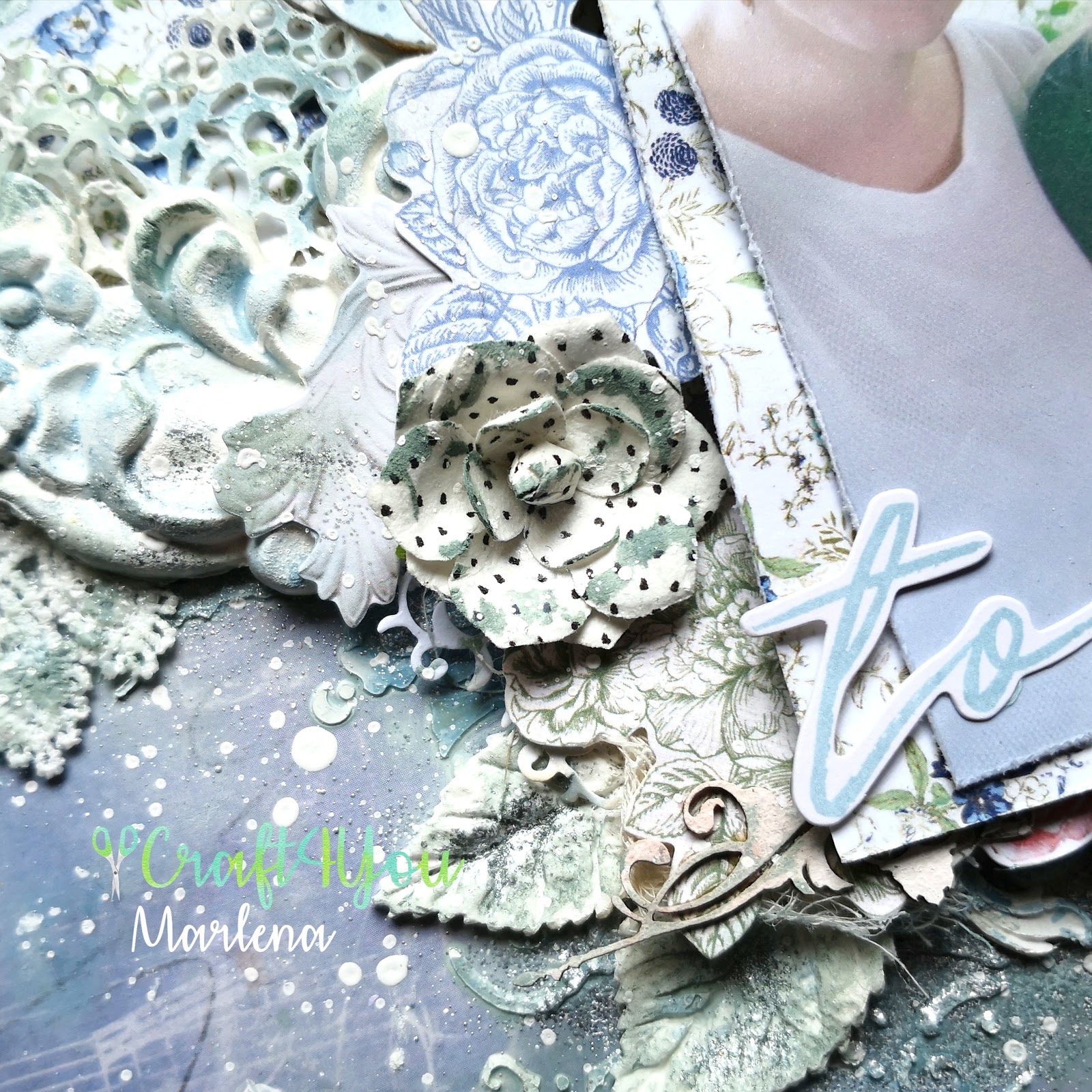 W tej pracy wykorzystałam przepiękny arkusz papieru od 49AndMarket, który wzbogaciłam dodatkami od Kaisercraft oraz papierami Prima Marketing. Kompozycję zbudowałam na tle przygotowanym z pasty modelującej i masek od 13@rts , które nieco podkolorowałam farbami kredowymi.